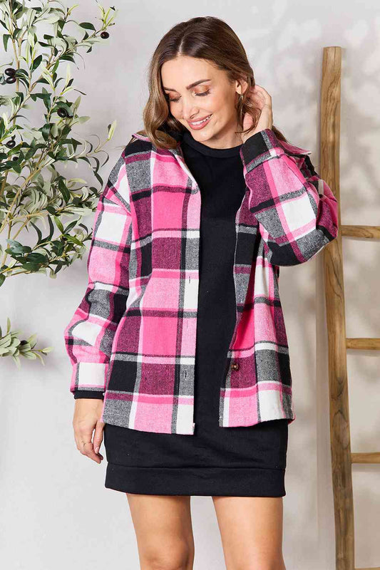 Double Take Plaid Button Front Shirt Jacket with Breast Pockets