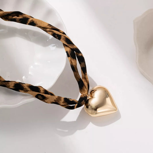 Leopard Print Choker with Golden Heart Pendant Necklace