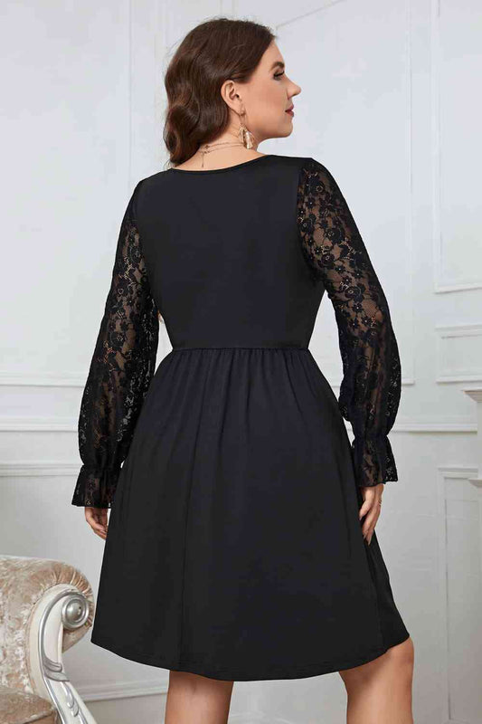 Melo Apparel Plus Size Lace Trim Round Neck Flounce Sleeve Dress