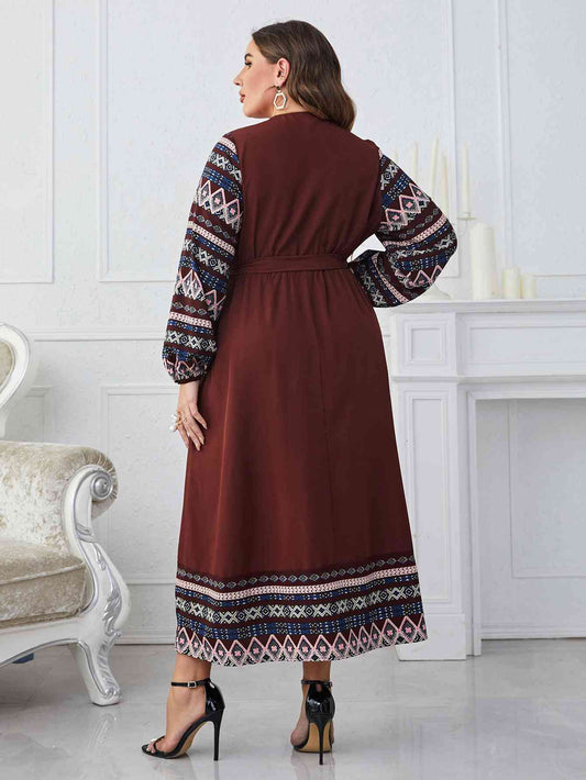 Melo Apparel Plus Size Printed Tie Belt Flare Sleeve Round Neck Midi Dress