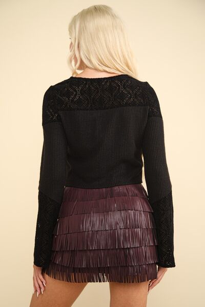 VERY J V-Neck Lace Detail Button Down Crop Ribbed Knit Top