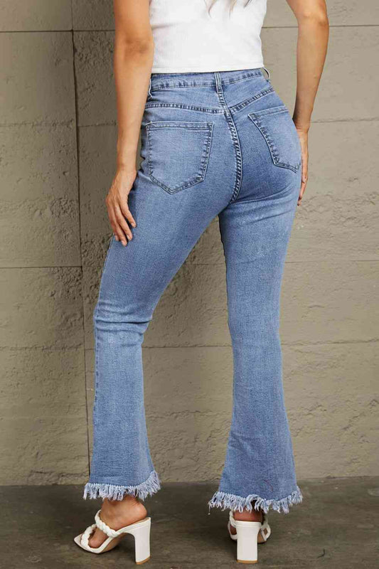 Baeful Distressed Raw Hem High-Waist Flare Jeans