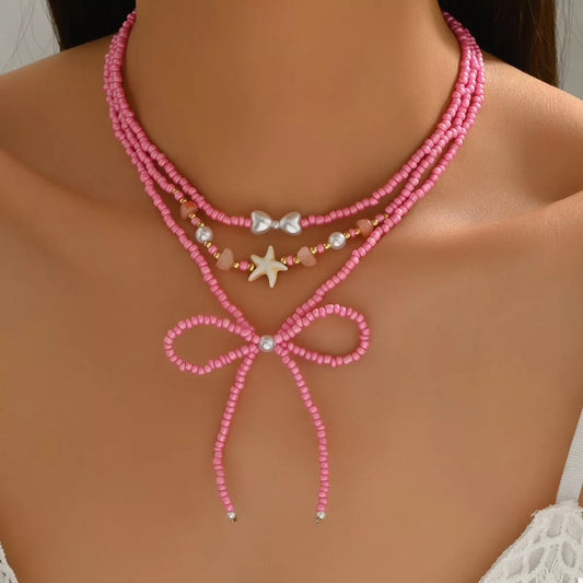 Beaded Three-Layered Necklace with Bow and Starfish Charms
