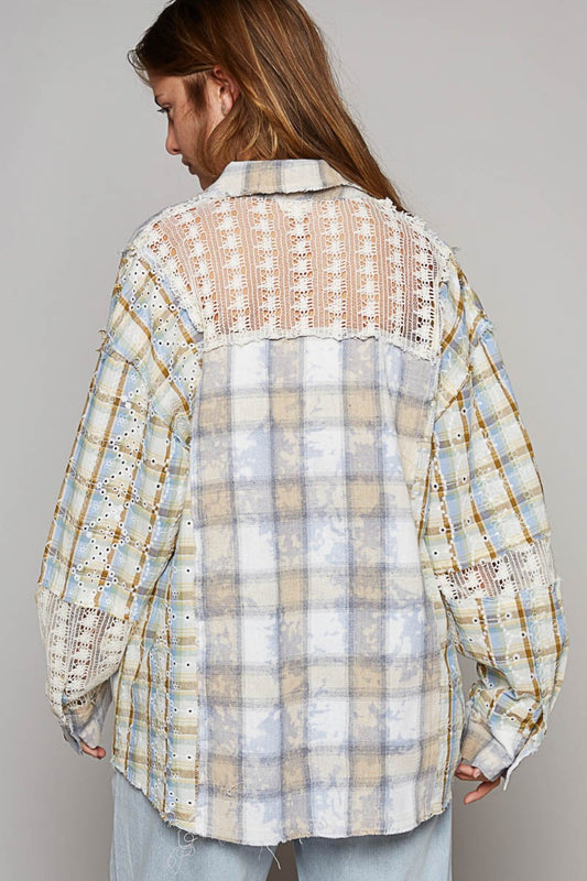 POL Long Sleeve Embroidered Crochet Plaid Shirt