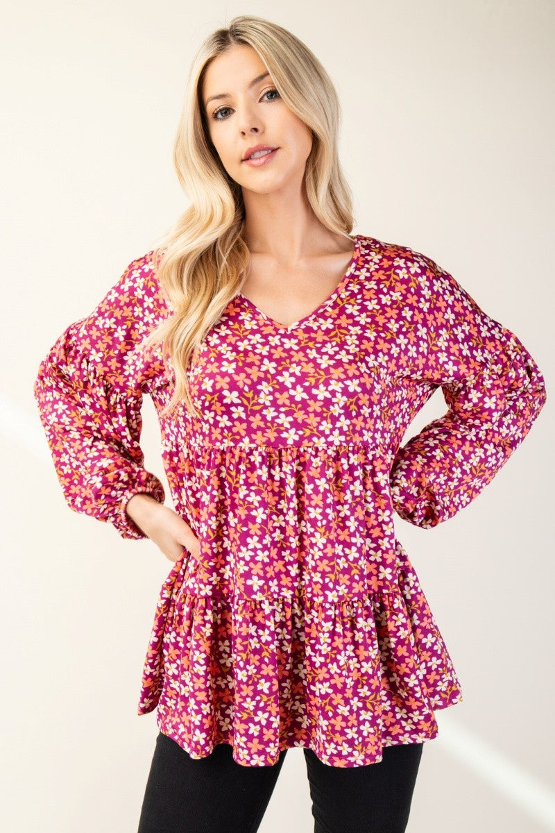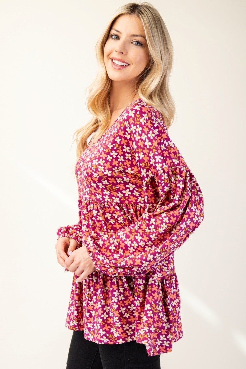 Celeste Full Size Floral V-Neck Balloon Sleeve Blouse