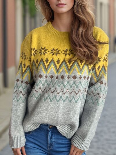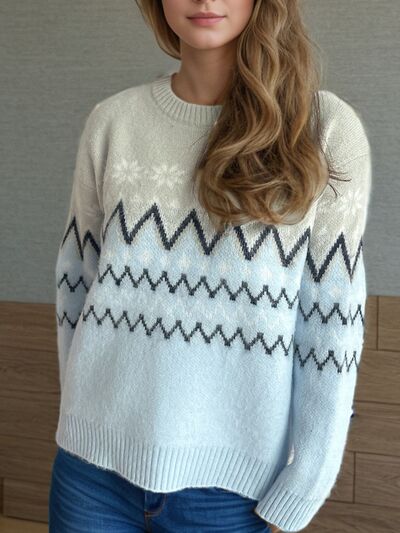 Chevron Contrast Round Neck Long Sleeve Sweater