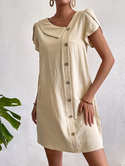 Decorative Button Asymmetrical Neck Short Sleeve Dress