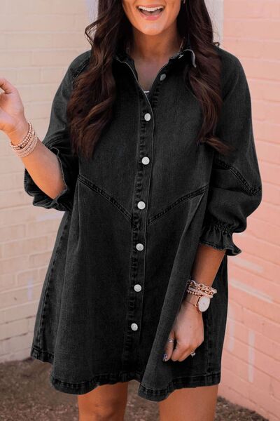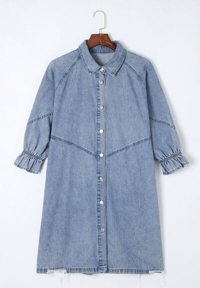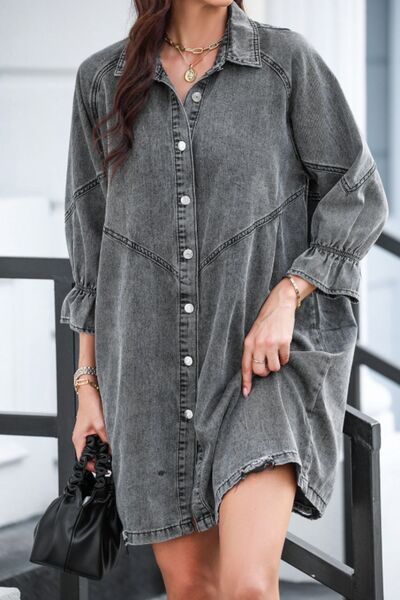 Distressed Collared Neck Flounce Sleeve Denim Dress