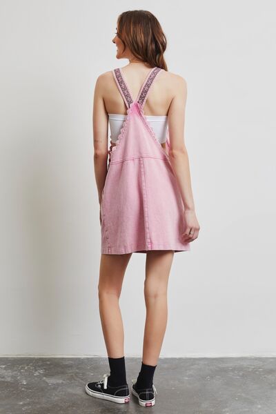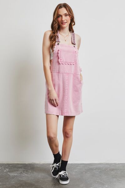 The Lace Trim Washed Overall Dress is a charming and versatile piece for a trendy and casual look. With delicate lace trim detailing and a washed denim finish, this overall dress exudes a chic and playful vibe. The overall style adds a touch of nostalgia and fun to the outfit. Made from comfortable and durable fabric, it is perfect for everyday wear. Pair it with a t-shirt or sweater underneath and sneakers for a laid-back ensemble. Elevate your wardrobe with this stylish Lace Trim Washed Overall Dress for a fashionable and effortless style.
