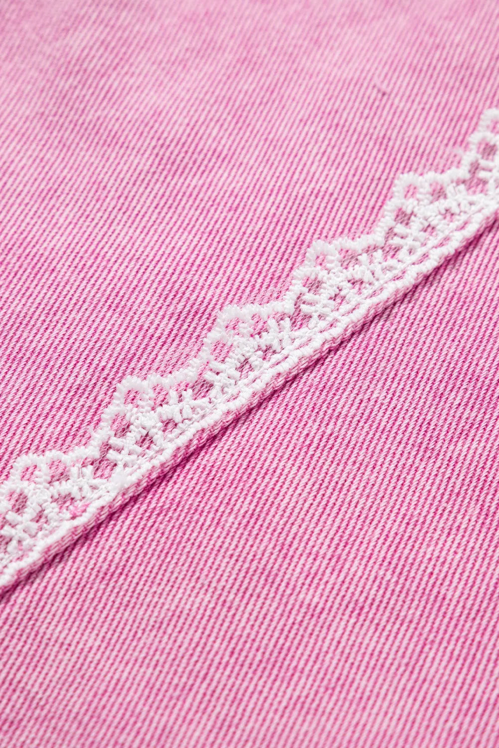 Lace Detail Distressed Raw Hem Long Sleeve Denim Jacket