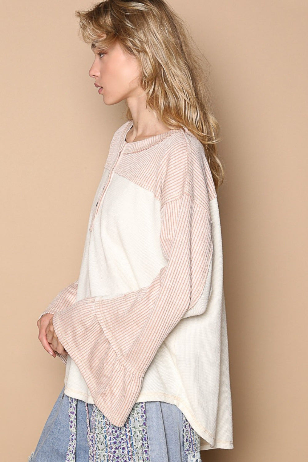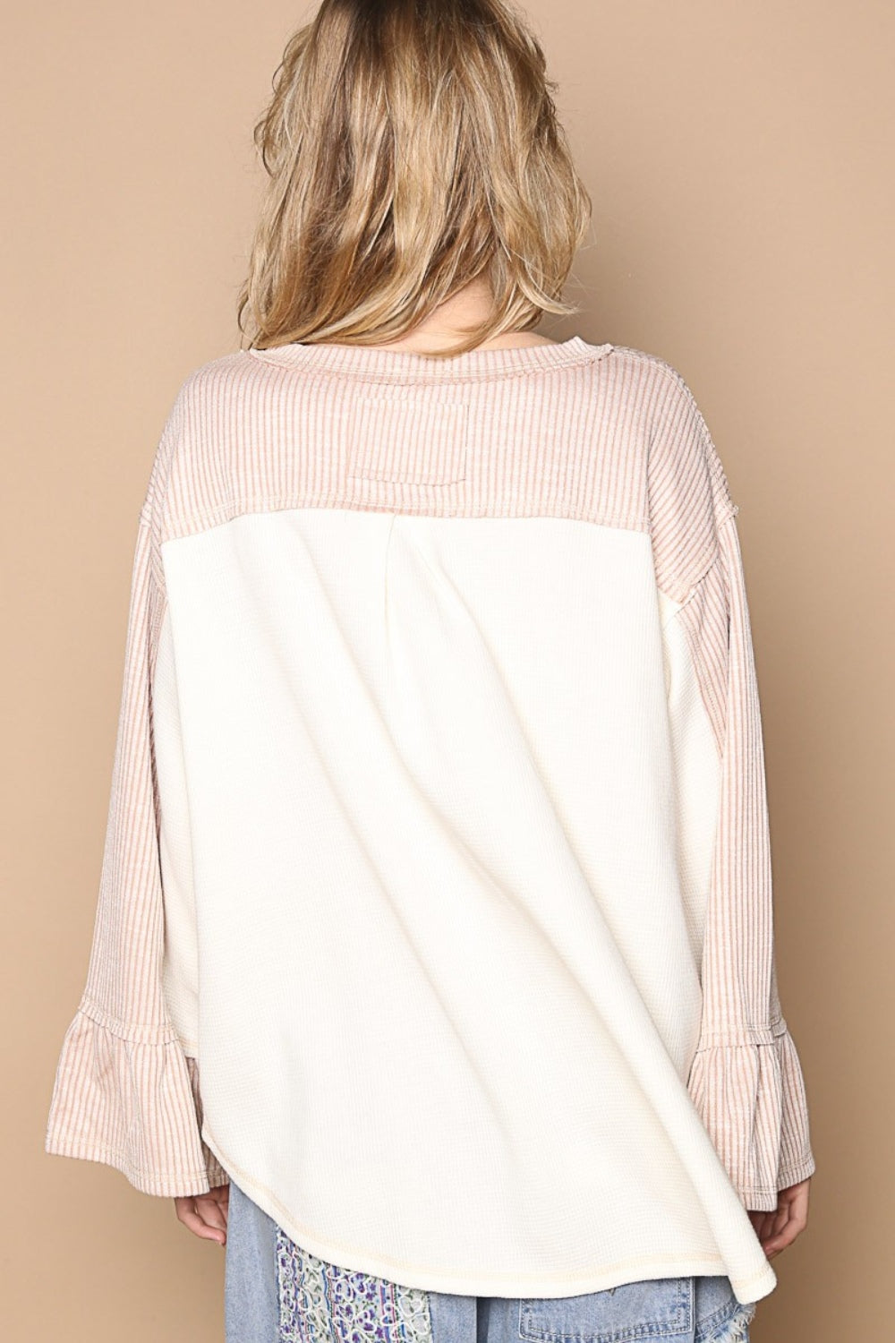Striped Flounce Sleeve Exposed Seam Top is a charming and stylish addition to your wardrobe. This top features a round neck, ruffle sleeves, and an oversized fit for a trendy and comfortable look. Made from thermal fabric, this top offers both warmth and texture. The exposed seam detailing adds a modern and edgy touch to the design. Elevate your outfit with the Striped Flounce Sleeve Exposed Seam Top, perfect for adding a touch of flair to your everyday style.