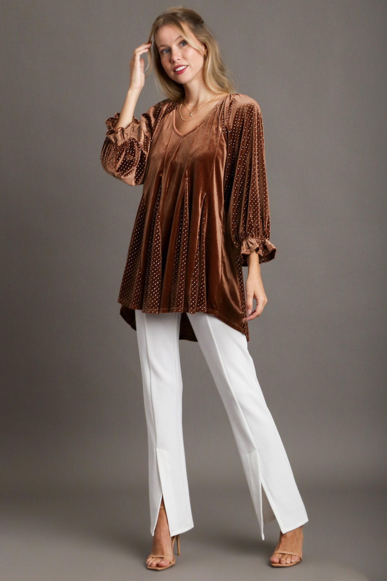 Umgee Godet Hem Polka Dot V-Neck Blouse
