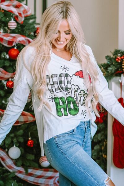 V-Neck Christmas Graphic High-Low Design Long Sleeve Top